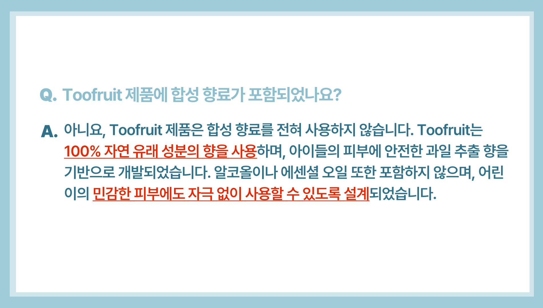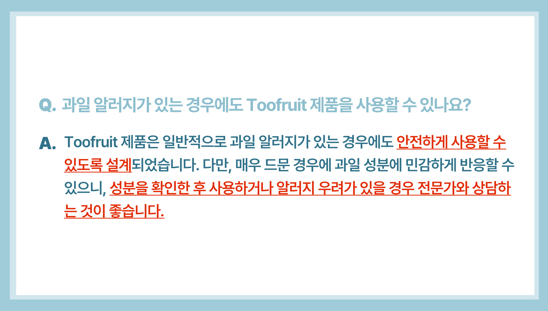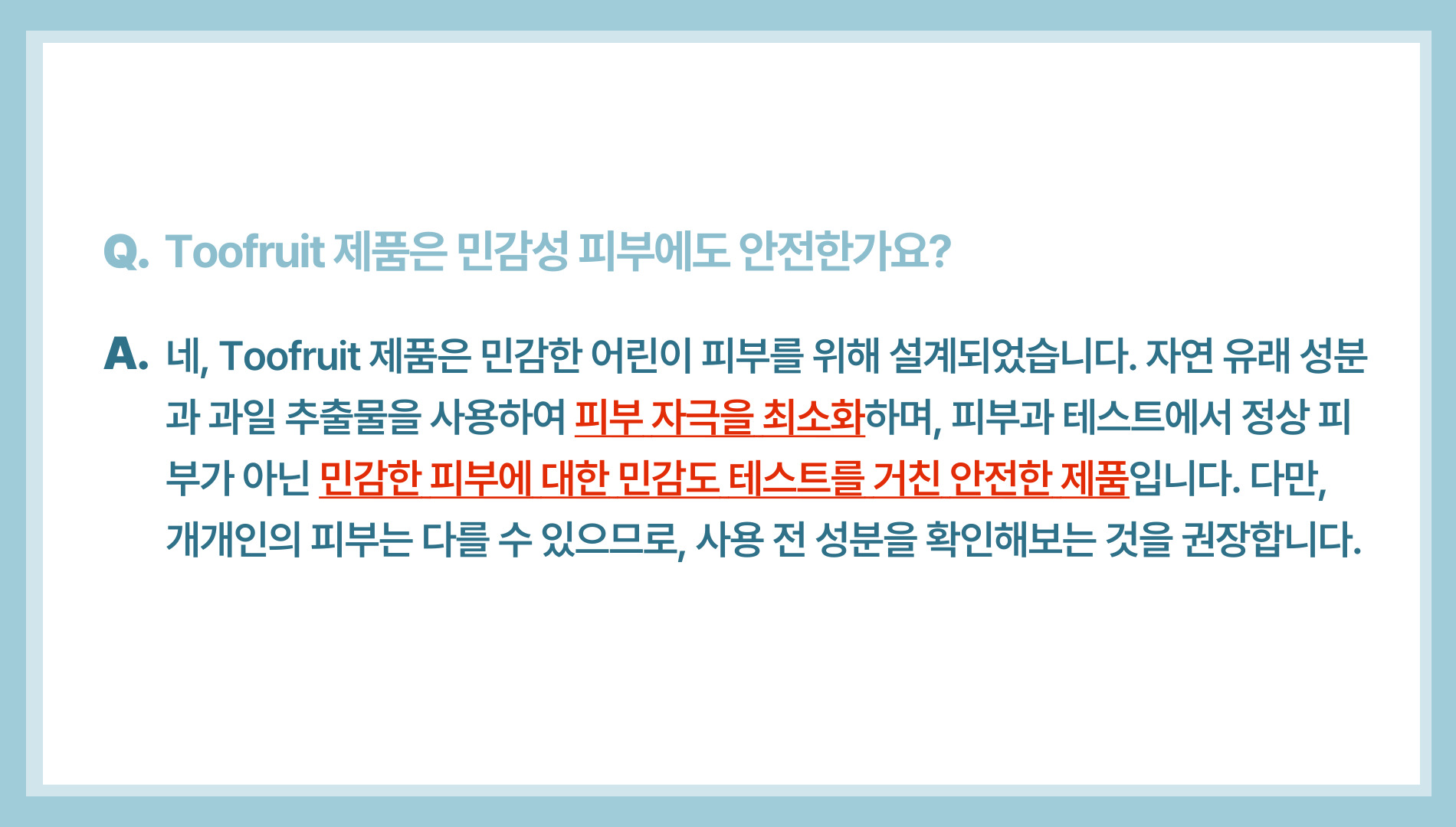 A. 네, Toofruit는 자연 유래 성분으로 만들어졌으며 민감한 피부 대상 테스트도 완료한 안전한 제품입니다. 다만, 개인차가 있을 수 있어 성분 확인을 권장합니다.