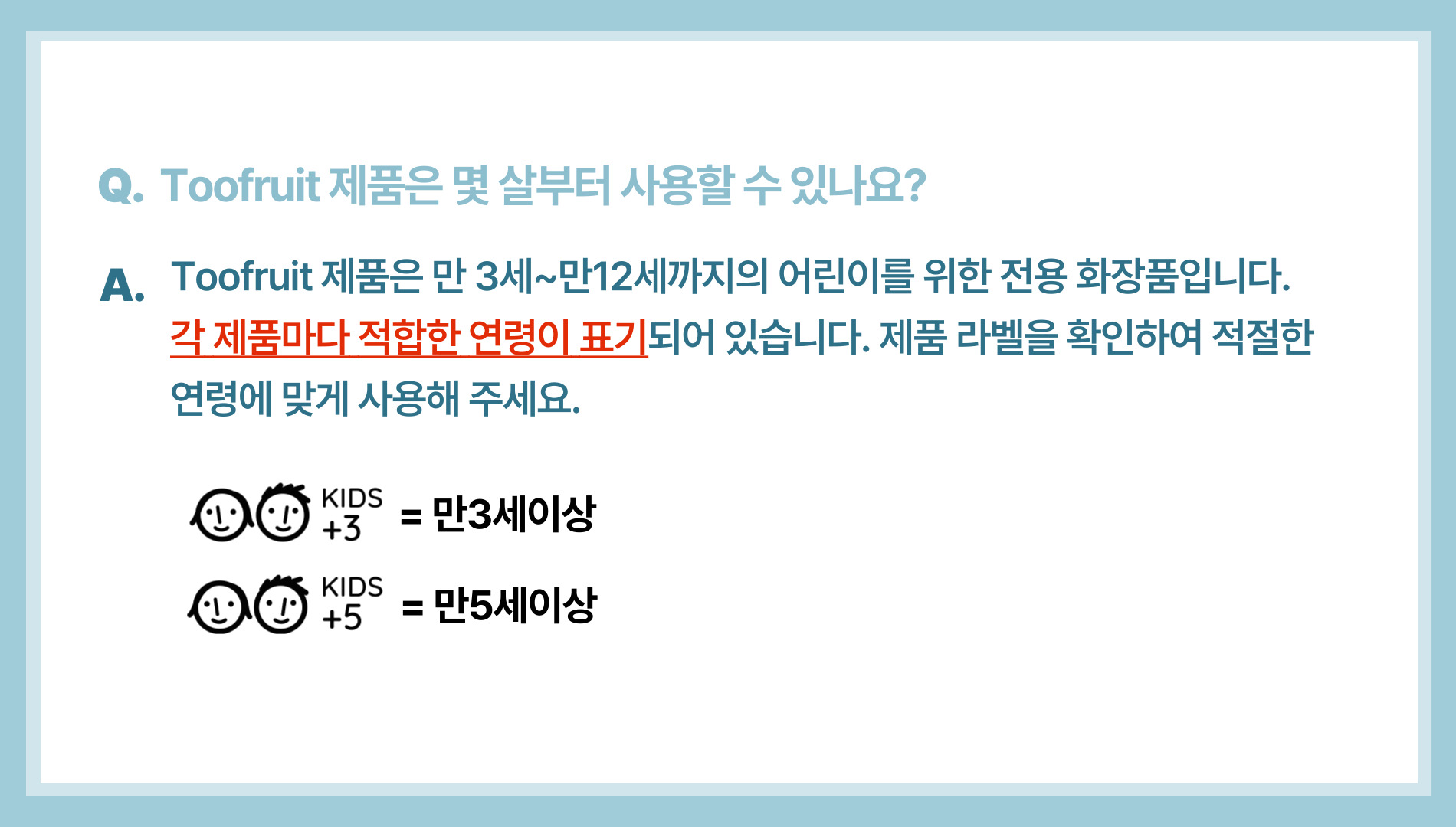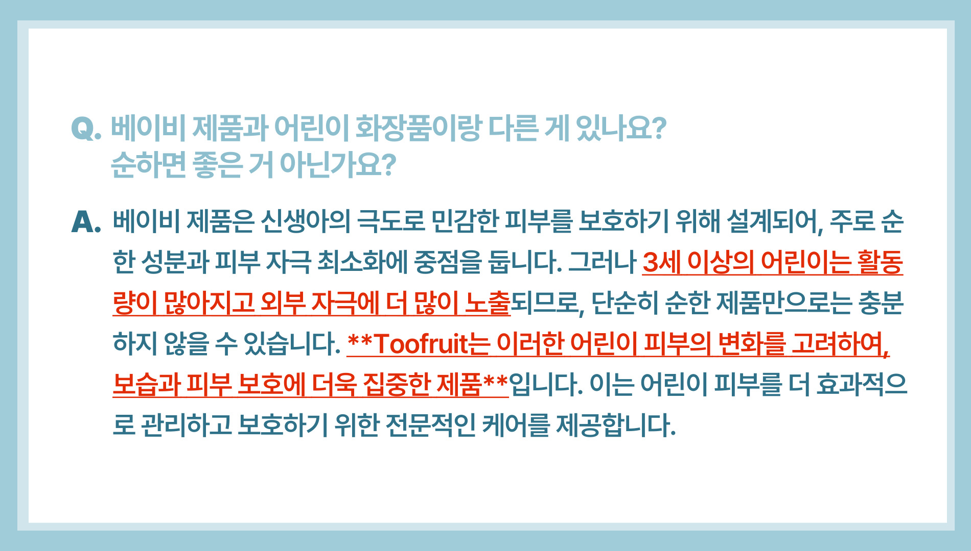 A. 아니에요. 외부 활동이 많아지는 3세 이상 아이들은 피부 발달에 맞춰 보습과 보호가 필요합니다. 특히, 3~12세 시기에는 이에 맞는 포뮬러를 가진 화장품을 선택하는 것이 중요합니다.