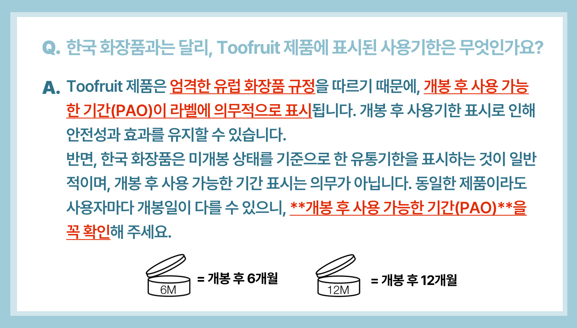 A. 네, 투프루트 제품은 유럽 기준에 따라 라벨에 개봉 후 사용기한(PAO)이 표시되어 있습니다.